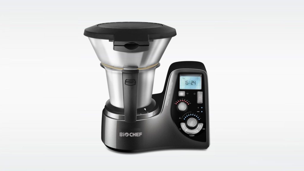 Jak czytamy z instrukcji importera – Biochef MyCook posiada duży ekran który umożliwia kontrolowanie funkcji urządzenia. Wszystkie dane takie jak temperatura, prędkość obrotów czy funkcja turbo są na nim widoczne. Indukcyjny silnik jest objęty patentem. Dzięki jego pracy potrawy ogrzewane są przez strumień powietrza, a nie jak w przypadku Thermomixa grzałkę.