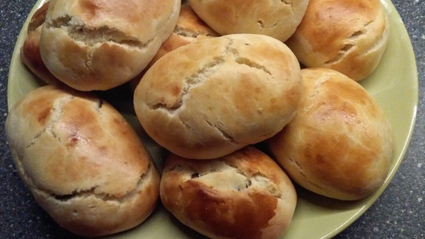 Ciasto wyłożyć na oprószoną mąką powierzchnie i rozwałkować na grubość 1,5cm .Foremką o średnicy 8 cm wycinać z niego krążki i ułożyć je na blachę .Bułeczki posmarować roztrzepanym jajkiem .Rozgrzać piekarnik do 180 C i piec 20 -25 min.podawać po ostudzeniu.