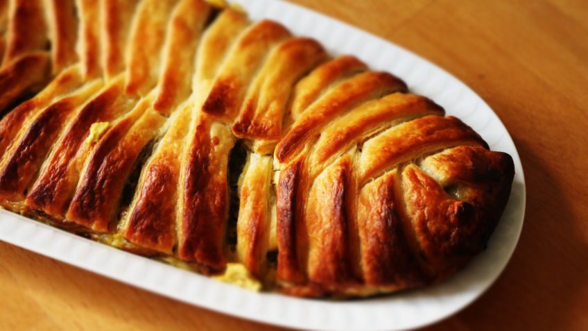 Nadzienie ułożyć wzdłuż ciasta, w środkowej jego części ułożyć farsz. Po środku położyć przekrojone polówki jajek na twardo , następnie zakryć farsz z dwóch stron paskami ciasta. lekko je krzyżując. Wierzch przeplatanki posmarować rozmąconym jajkiem.